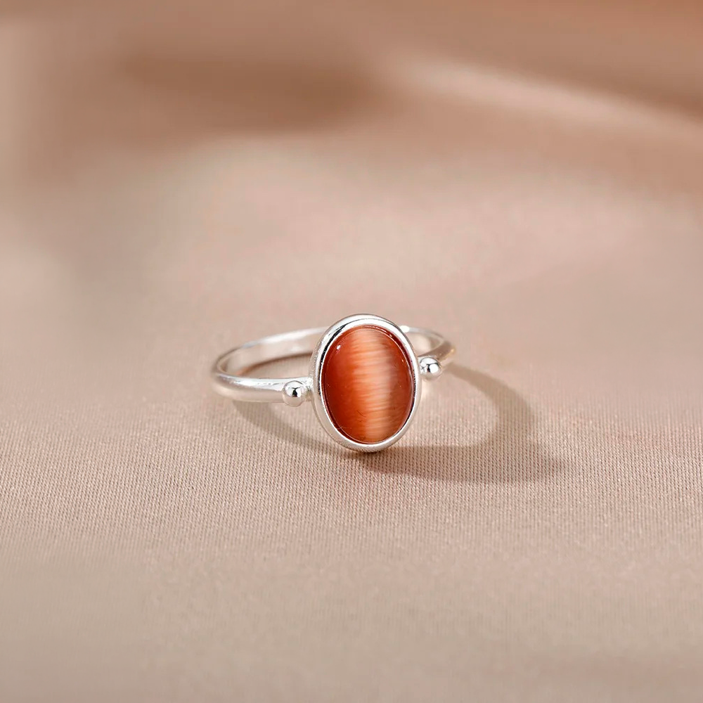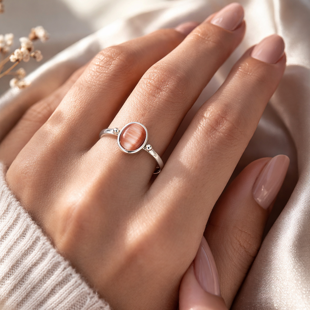 Anillo de diseño delicado y atemporal, elaborado en metal plateado pulido que realza la suavidad de su piedra central. La gema ovalada en tono coral rosado presenta vetas luminosas que crean un efecto sedoso y cambiante con la luz, convirtiéndolo en una pieza sutil pero con carácter.
