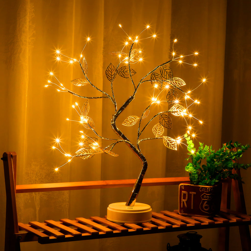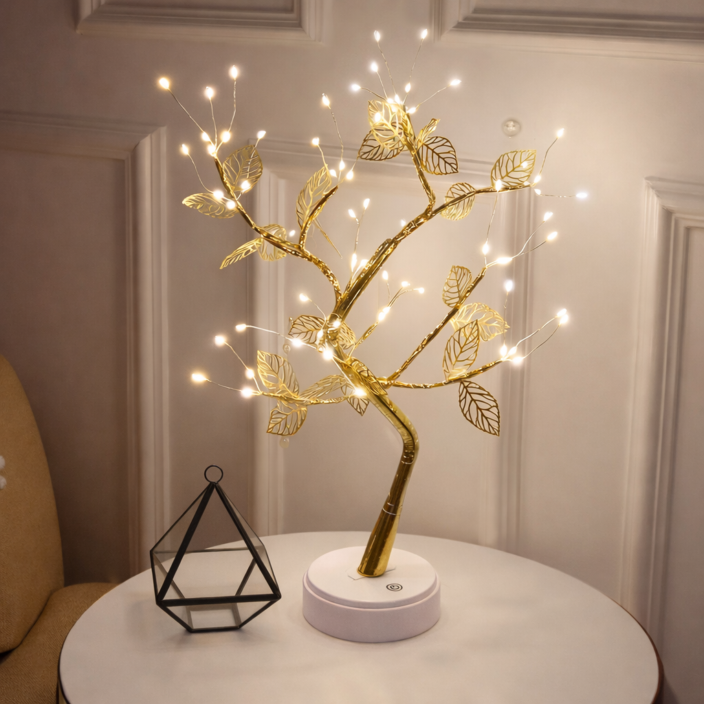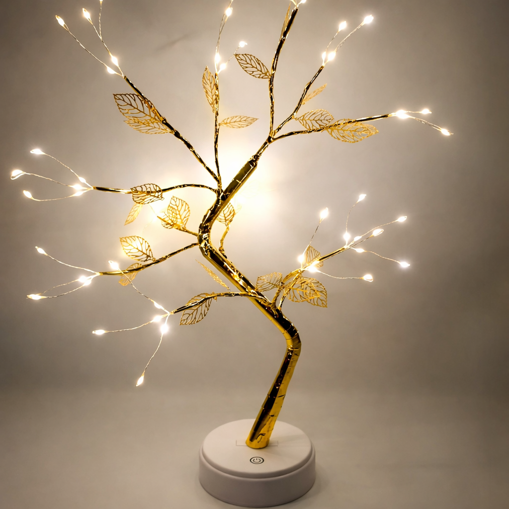 El Árbol Aura de Luz es una lámpara decorativa de diseño delicado, inspirada en las formas de la naturaleza. Su estructura dorada y sus pequeñas luces cálidas crean un ambiente suave y acogedor, ideal para iluminar espacios sin saturarlos.