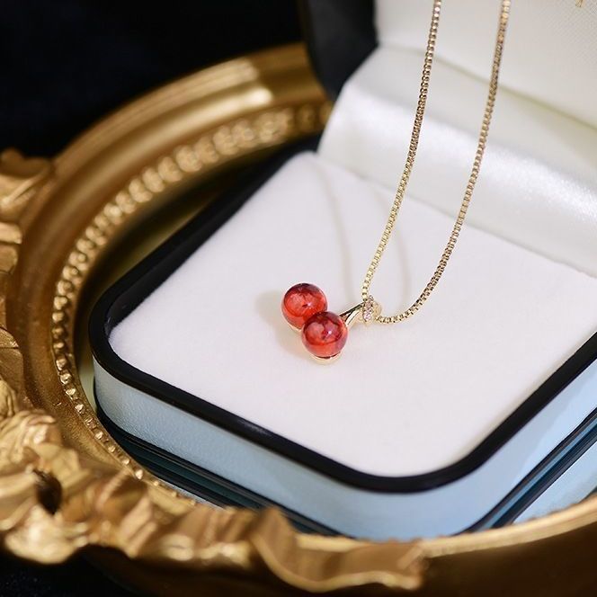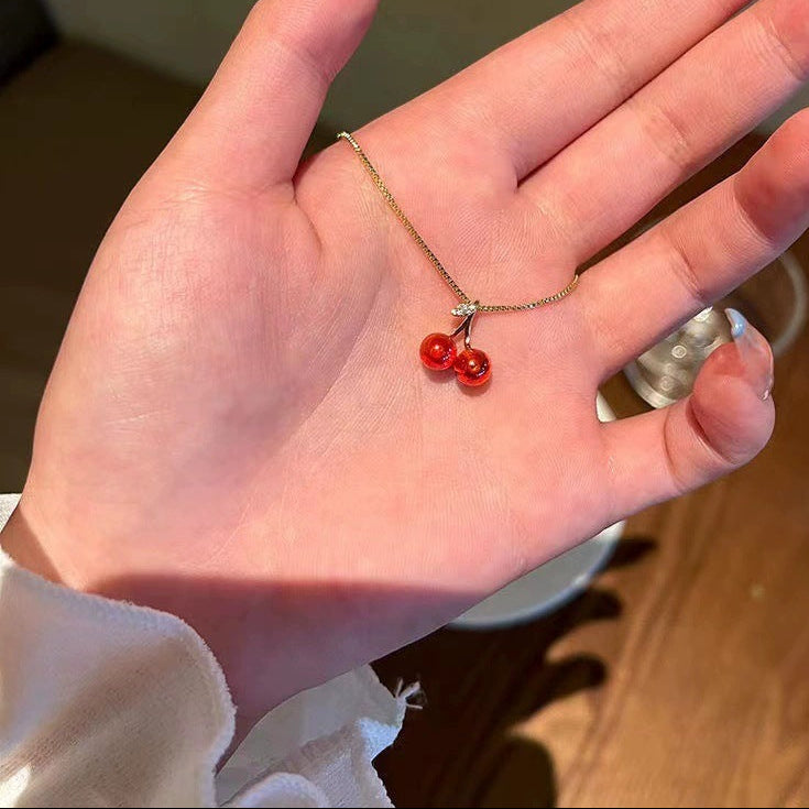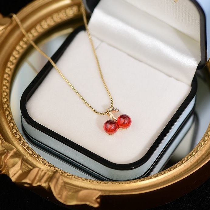 Su protagonista es un pequeño dije de cerezas en tono rojo brillante, acompañado de una hojita con sutiles destellos, creando un diseño fresco y lleno de personalidad. La cadena fina tipo caja en acabado dorado le da un aire elegante y moderno, equilibrando lo lúdico con lo sofisticado.