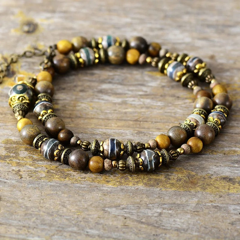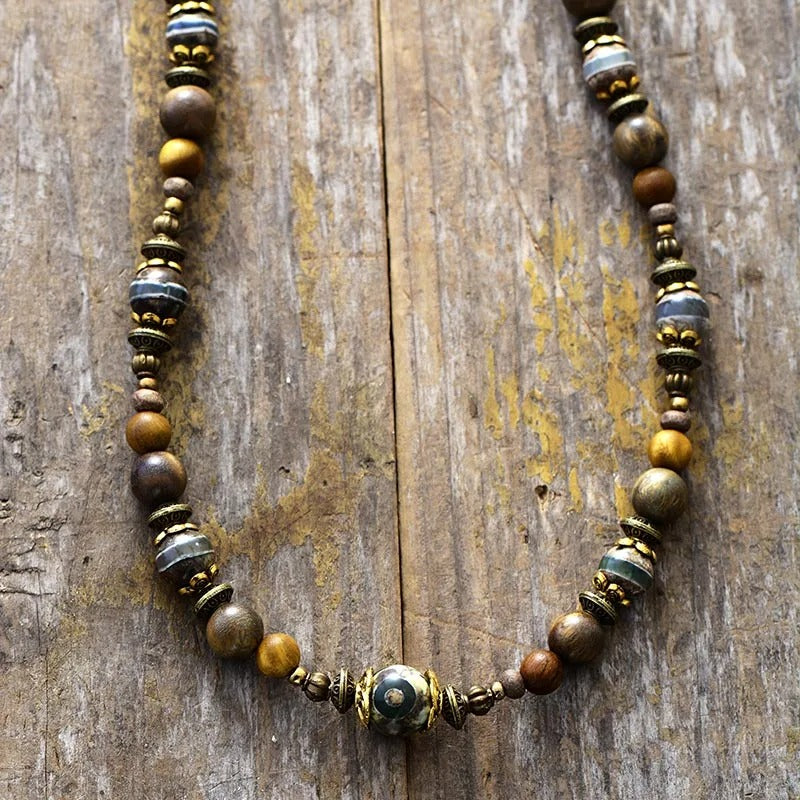 El Collar Guerrero del Desierto es una pieza que evoca fuerza, tierra y sabiduría ancestral. Hecho con cuentas de tonos cálidos y naturales, cada detalle metálico está inspirado en símbolos tribales que conectan con la protección y el coraje interior.