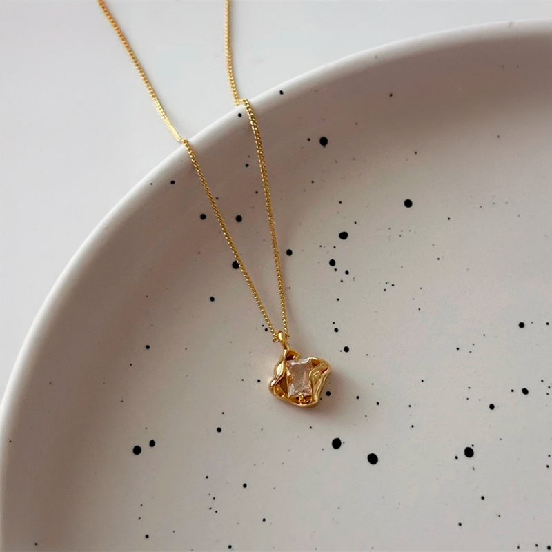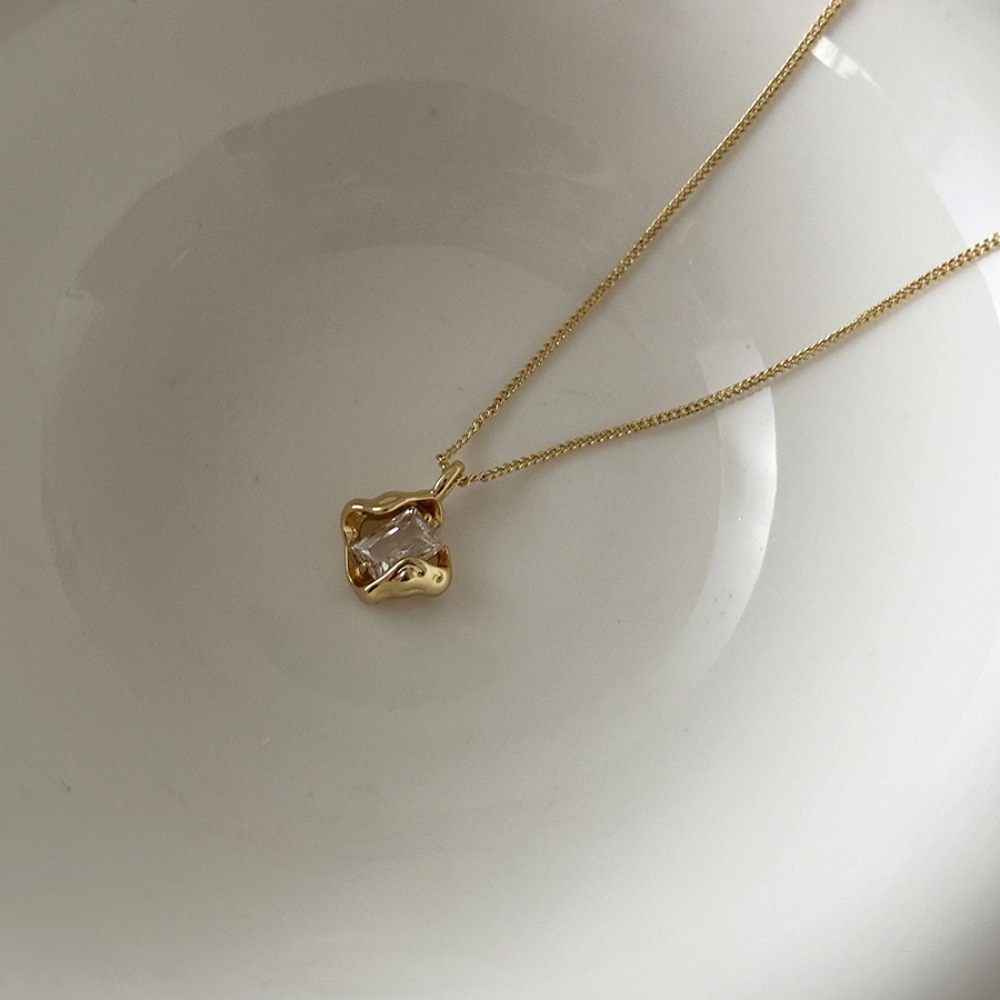 Collar dorado con cadena fina y colgante de cristal transparente en corte rectangular, rodeado por un marco orgánico de acabado fluido. Su diseño moderno y artístico equilibra elegancia y originalidad, ideal para quienes buscan un accesorio único que destaque con sutileza y sofisticación.