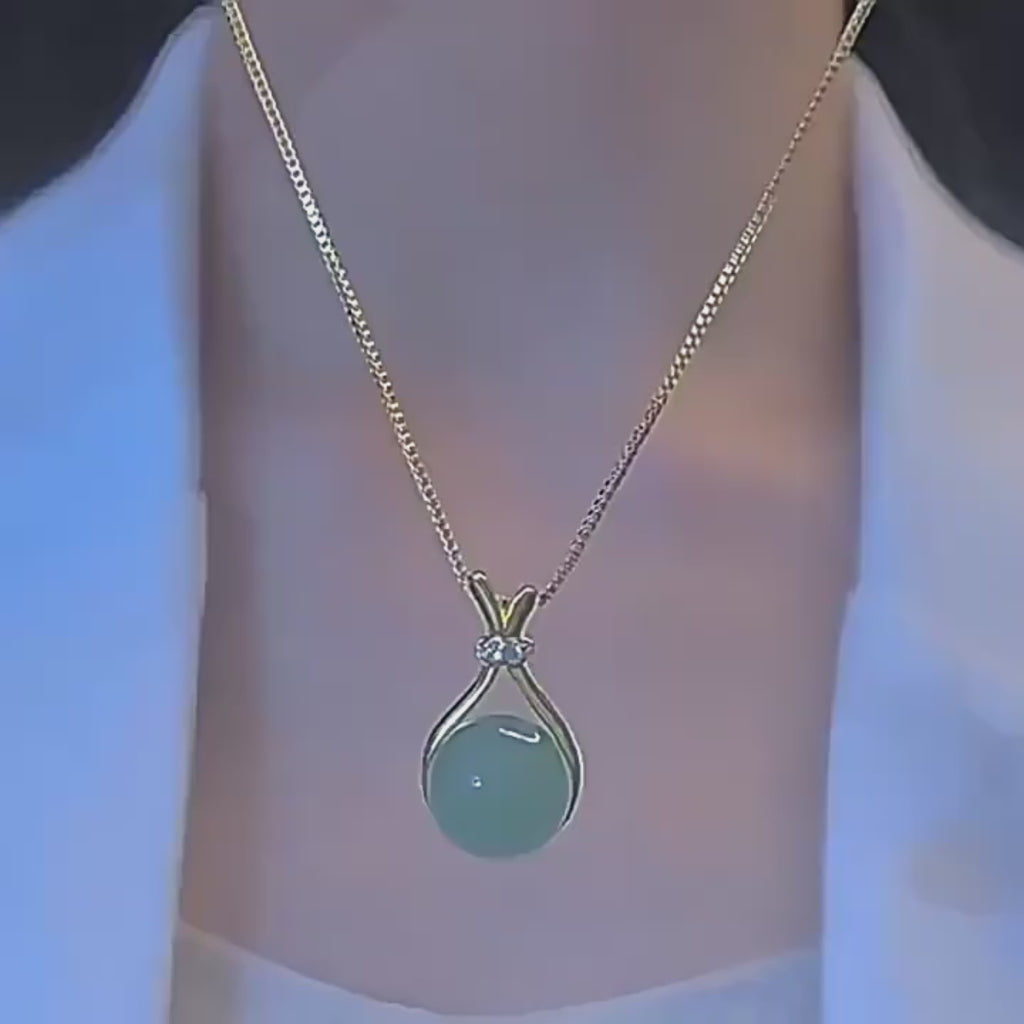 Collar dorado con cadena fina y colgante en forma de gota, engastado con piedra verde pulida que aporta un brillo natural y elegante. Su diseño sutil y sofisticado lo convierte en un accesorio ideal para ocasiones formales o para dar un toque refinado a un look diario.