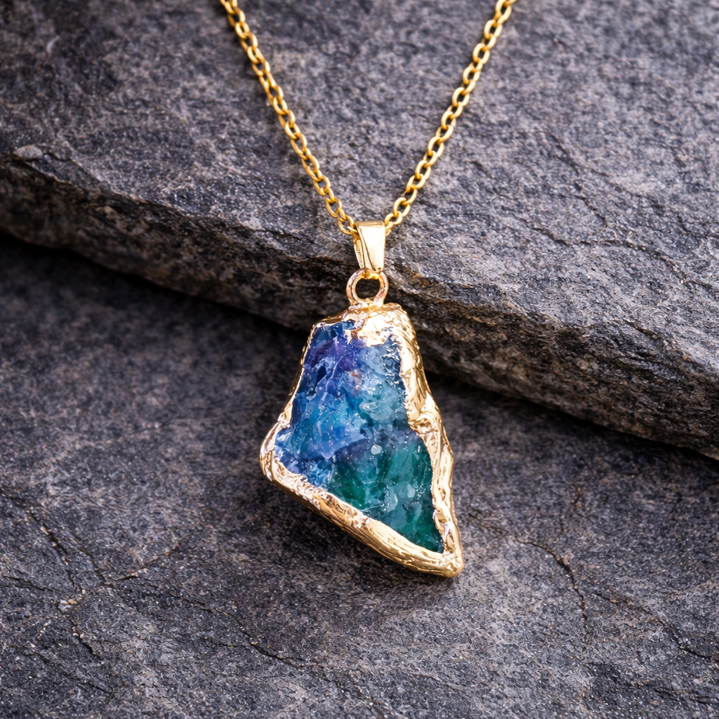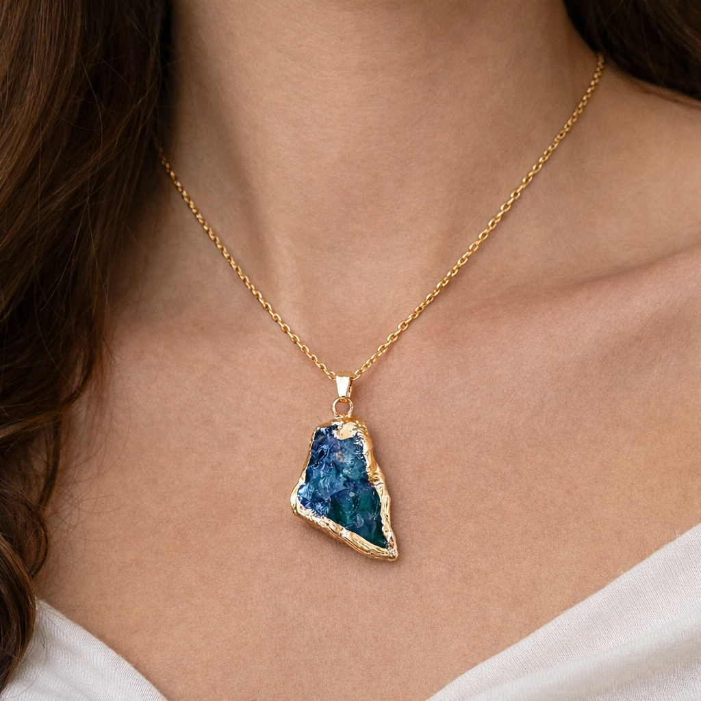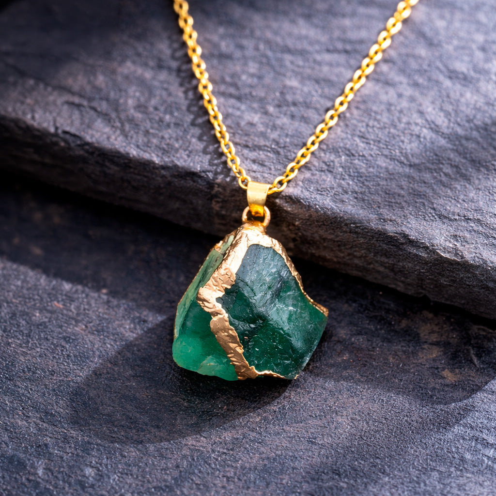 Este collar presenta una piedra en bruto de tonalidad verde profunda, conservando su forma original para transmitir autenticidad, equilibrio y conexión con la tierra.