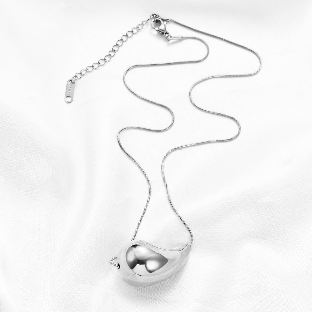 Su dije en forma de gota, de acabado pulido y forma orgánica, crea un efecto moderno y armonioso. El tono plateado le da un aire fresco y versátil, ideal para quienes prefieren accesorios más neutros y atemporales.