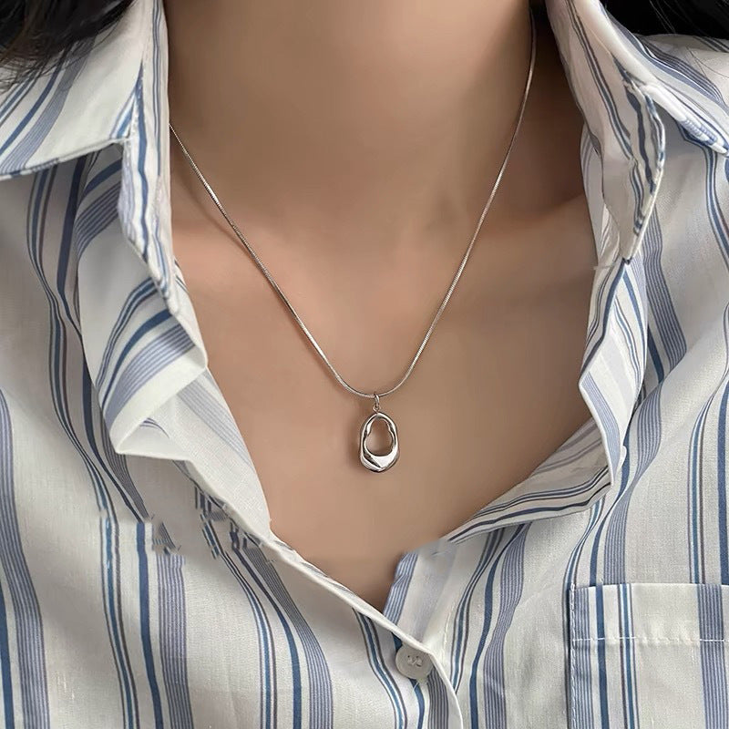 Collar plateado con cadena fina y colgante en forma de aro irregular de estilo orgánico. Su diseño minimalista y moderno aporta un aire elegante y versátil, ideal para usar a diario o en ocasiones especiales, manteniendo un equilibrio entre sencillez y sofisticación.