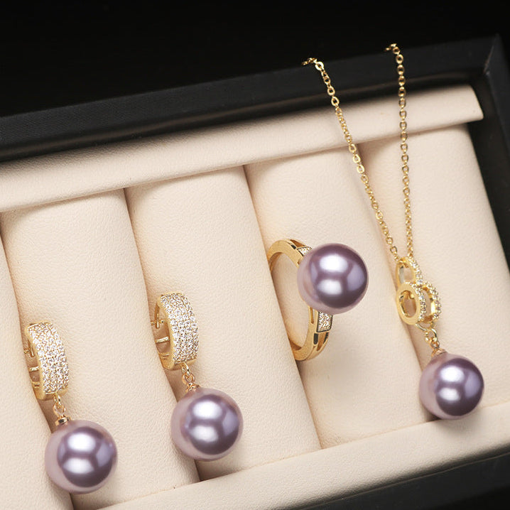 Un set elegante y femenino compuesto por collar, aros y anillo, todos con una perla central en tonos suaves y delicados. Los detalles dorados aportan un brillo cálido que realza la belleza de la perla, creando una armonía perfecta entre sofisticación y dulzura.