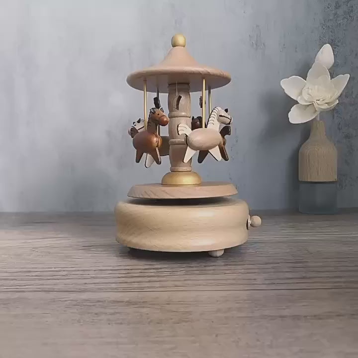 Caja musical de madera con diseño de carrusel clásico. Tallada con detalles delicados, incluye caballitos que giran alrededor de un eje central bajo un techo en forma de pabellón. Su acabado natural resalta la calidez de la madera, convirtiéndola en una pieza decorativa encantadora y nostálgica, ideal para ambientar espacios con un aire tierno y elegante.