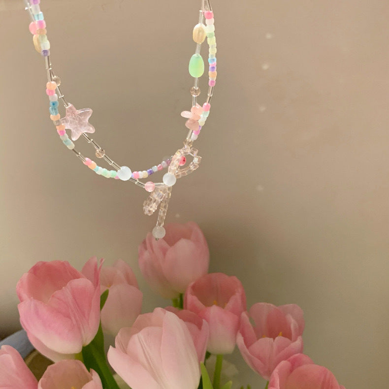 | Descripción | Collar de doble vuelta con diseño multicolor suave y dije de lazo artesanal. |