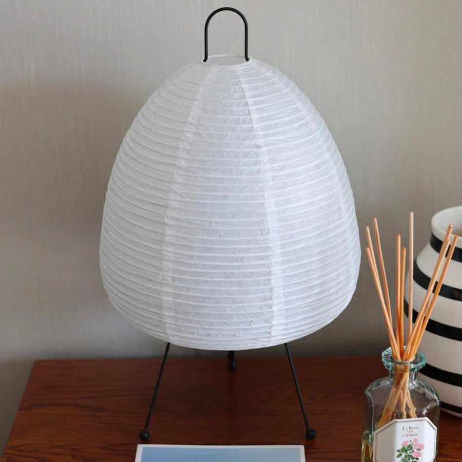 Lámpara de mesa de estilo japonés, elaborada con pantalla de papel color blanco y estructura de patas altas, que le otorgan una presencia liviana y elegante. Su diseño sencillo y vertical alcanza una altura aproximada de 47 cm, ideal para aportar luz ambiental sin recargar el espacio.
