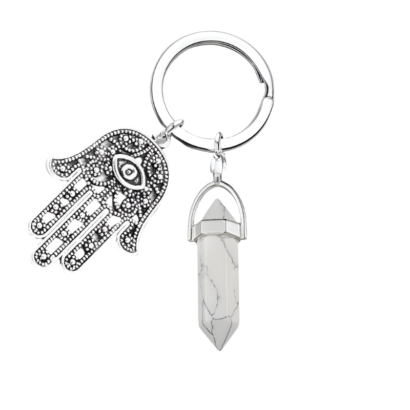 Llavero mano de Fátima con piedra hexagonal de Turquesa Blanca, perfecto para llevar contigo un poco de esta maravillosa figura espiritual.