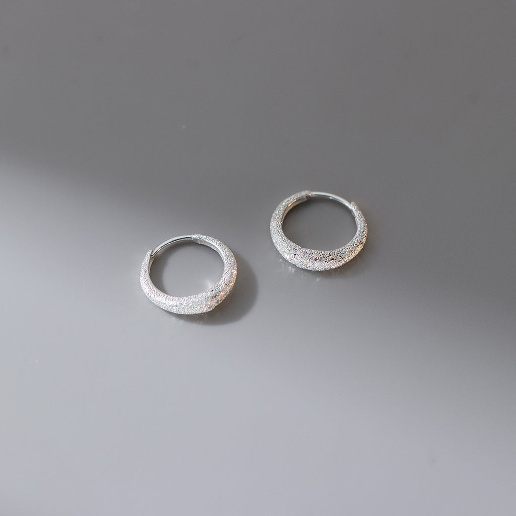 Hermosos aros hechos de plata 925 con acabado rugoso brillante.
