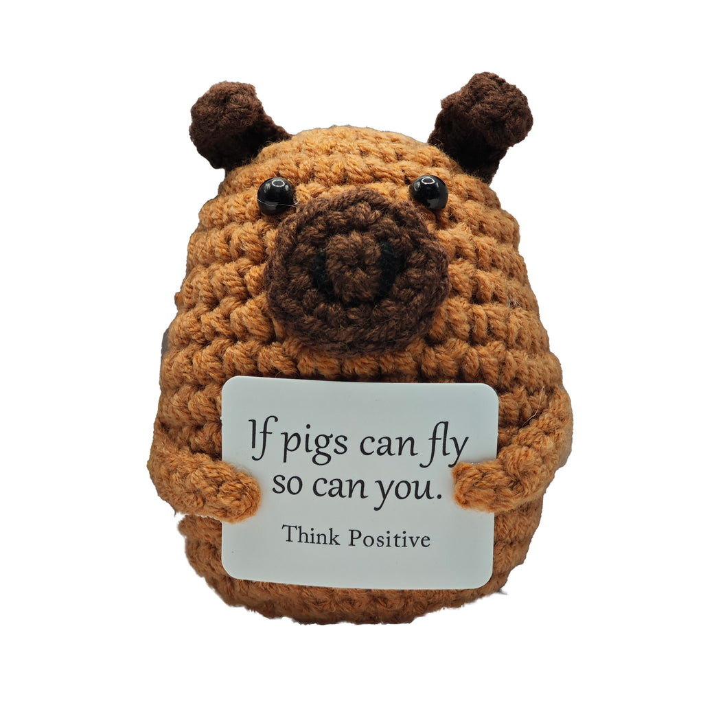 Peluche tejido a mano, el regalo perfecto o para decorar tu espacio. Este encantador Chanchito Positiva lleva consigo un mensaje positivo para alegrarle el día a cualquier persona.