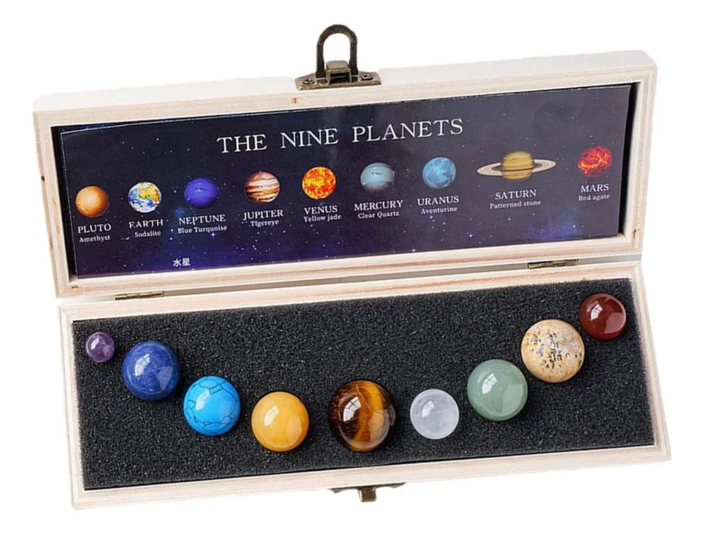 Caja de colección con esferas de piedras naturales representando los nueve planetas. Cada esfera está tallada en diferentes minerales como amatista, turquesa, jade, ojo de tigre, cuarzo y ágata, entre otros, simulando los colores característicos de cada planeta. Presentadas en un estuche de madera con tapa ilustrada, esta pieza combina belleza decorativa con un toque educativo, ideal para regalar o para quienes disfrutan de la armonía de la naturaleza y el universo.