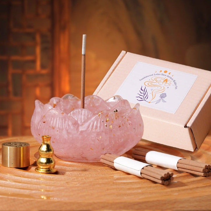 Set de incienso con porta inciensos de Cuarzo Rosa. Incluye un soporte en forma de flor de resina con piedritas de cuarzo rosa y destellos dorados, dos porta inciensos metálicos en tonos dorados y varillas de incienso natural. Presentado en una caja elegante, es un kit ideal para crear ambientes relajantes, purificar espacios y acompañar prácticas de meditación o bienestar.