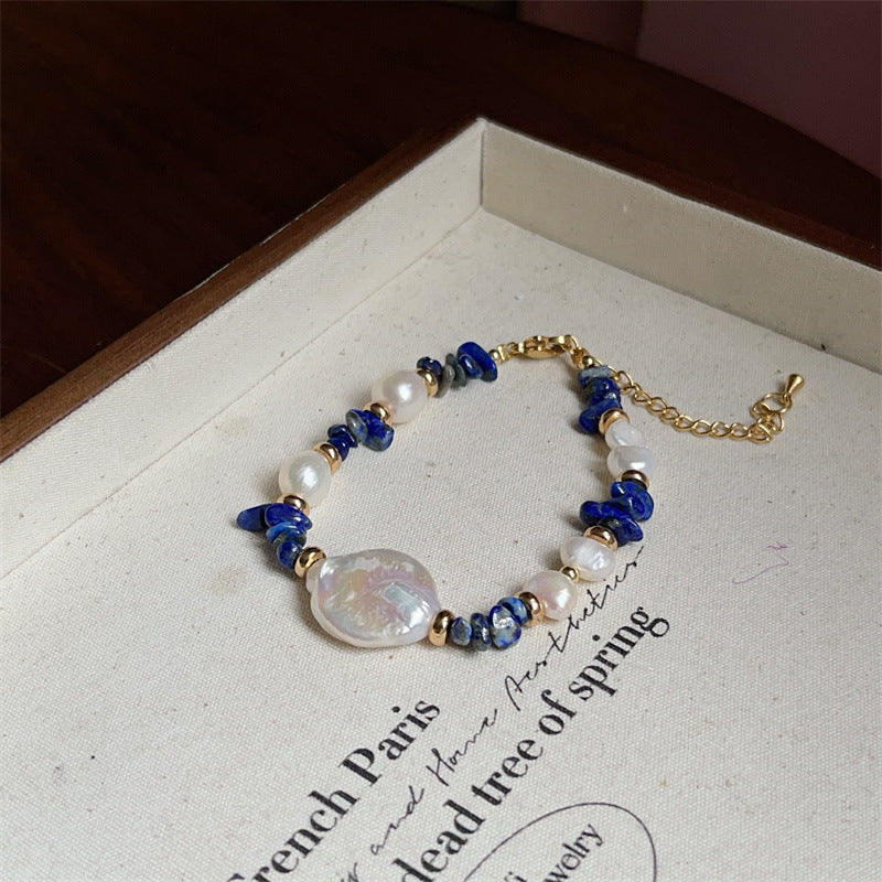 Diseñada con piedras irregulares de lapislázuli y perlas barrocas, esta pulsera combina la fuerza espiritual del azul profundo con la suavidad de las perlas. La perla central, más grande y aplanada, simboliza el equilibrio y la claridad.