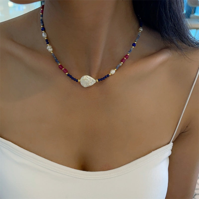 Collar vibrante y contemporáneo que combina cuentas en azul profundo, tonos rojos intensos y perlas que suavizan el diseño. Los detalles dorados aportan luminosidad y equilibrio, mientras que un colgante central en acabado nacarado otorga un toque distintivo y sofisticado.
