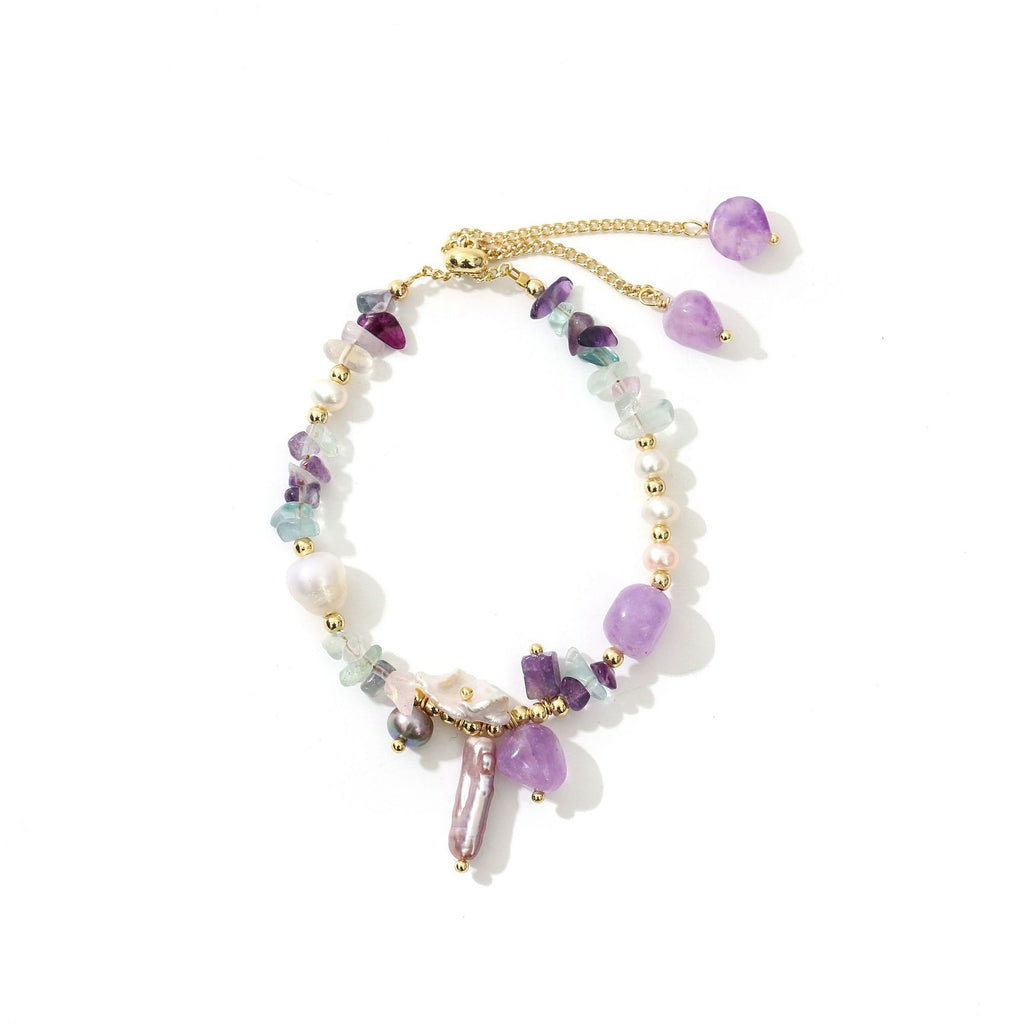 El violeta de la amatista evoca calma y equilibrio, mientras que las perlas transmiten suavidad y serenidad. La mezcla de tonalidades claras y oscuras crea una pieza versátil que realza tanto atuendos diarios como conjuntos más sofisticados, con un estilo fresco y lleno de personalidad.