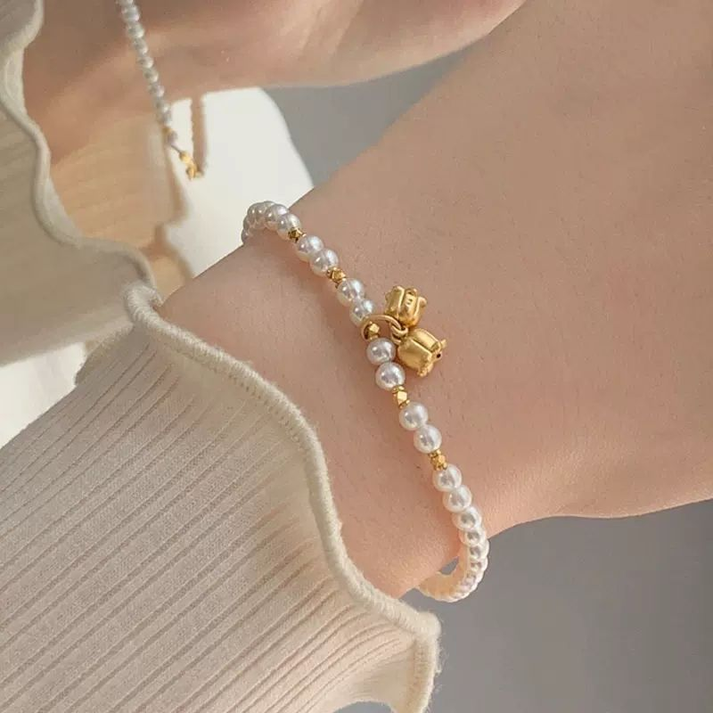 Pulsera fina y minimalista elaborada con perlas pequeñas intercaladas con delicados detalles dorados. En el centro resalta un dije con forma de pequeño de lor, que le da un aire tierno y juvenil, sin perder elegancia.