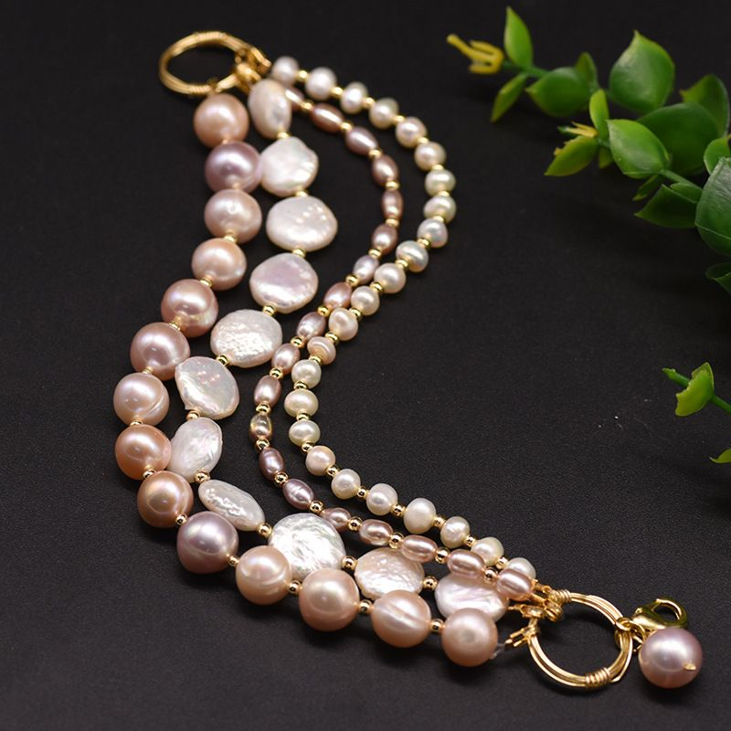 | Descripción | Pulsera de eslabones con múltiples dijes colgantes de perla y metal labrado. |