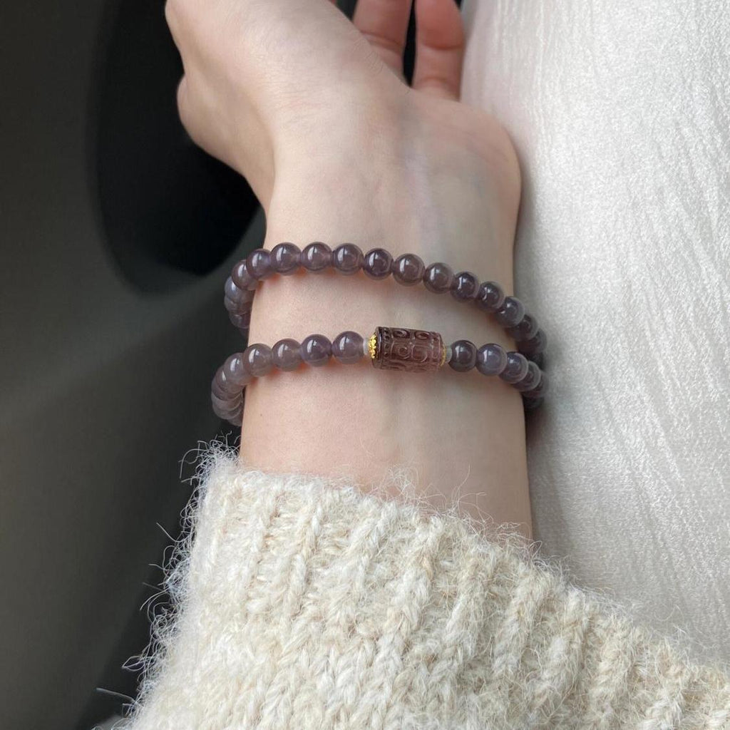 Brazalete elástico de cuentas en piedras grises, diseñado en doble vuelta para envolver la muñeca con estilo moderno y elegante. Su pieza central en forma de cilindro grabado, aporta un detalle distintivo y sofisticado que resalta entre las cuentas pulidas.