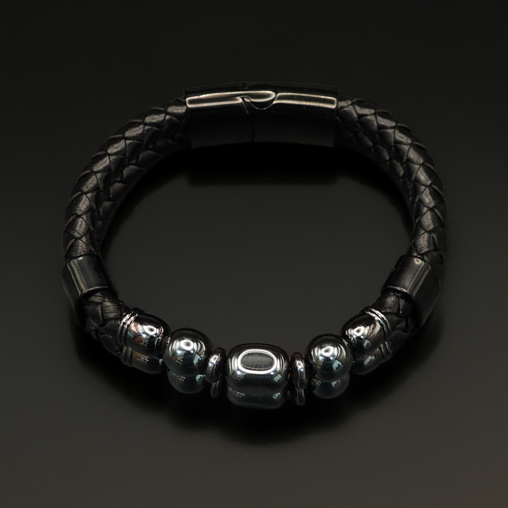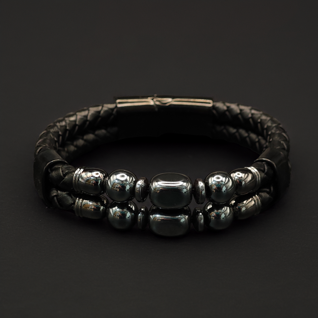 Pulsera masculina de estilo moderno, confeccionada con cuerina negra en doble diseño: una parte trenzada y otra lisa con costura blanca en contraste. Al centro lleva un tubo metálico en acabado brillante oscuro, que aporta fuerza visual y un carácter contemporáneo.