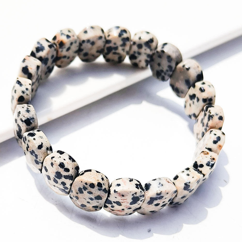 Esta pulsera elástica está confeccionada con piezas pulidas de jaspe dálmata, una piedra reconocida por su distintivo patrón moteado en tonos beige y negro que evoca la energía alegre y juguetona del animal que le da nombre. Cada cuenta rectangular conserva sus vetas naturales, lo que hace de cada pieza un accesorio único e irrepetible.