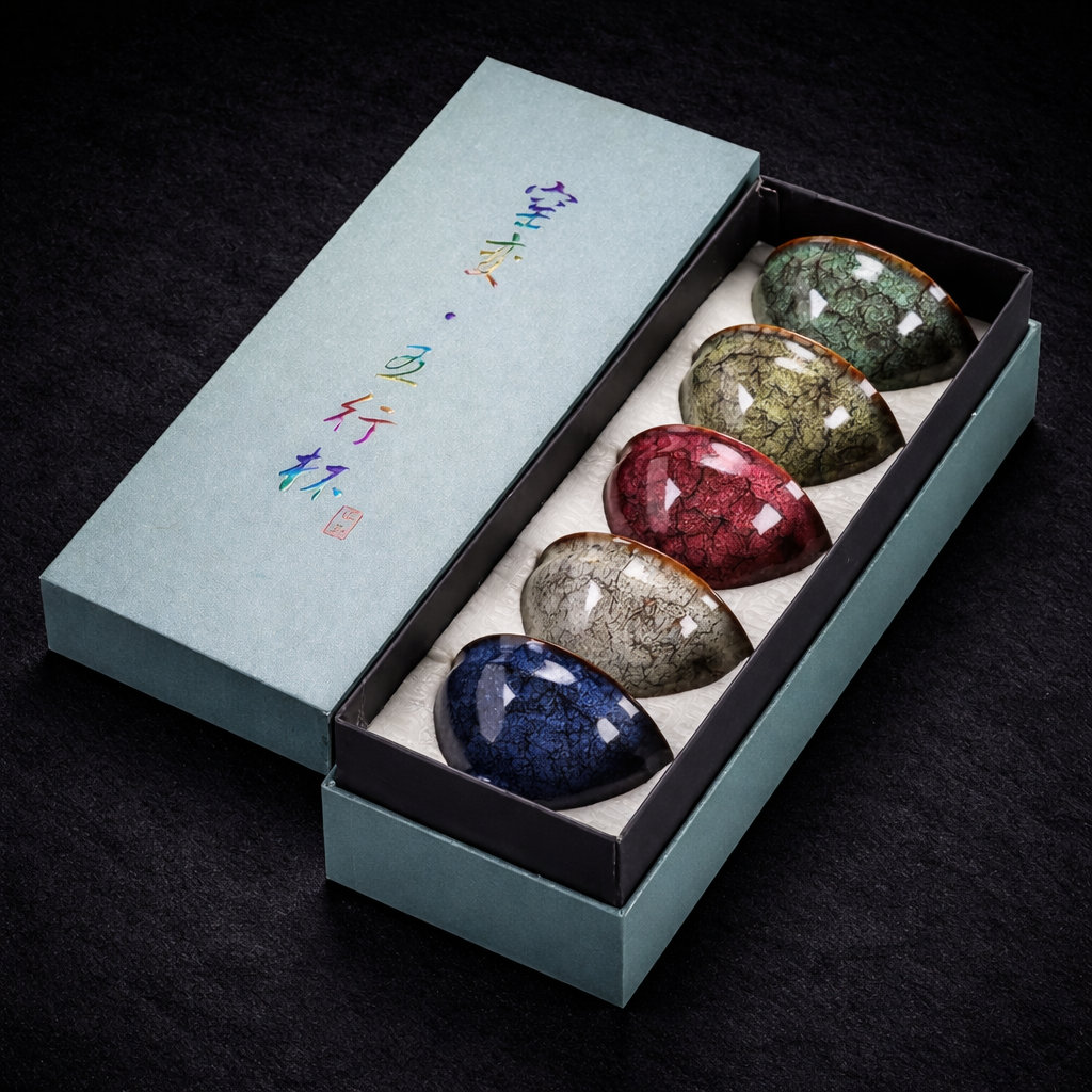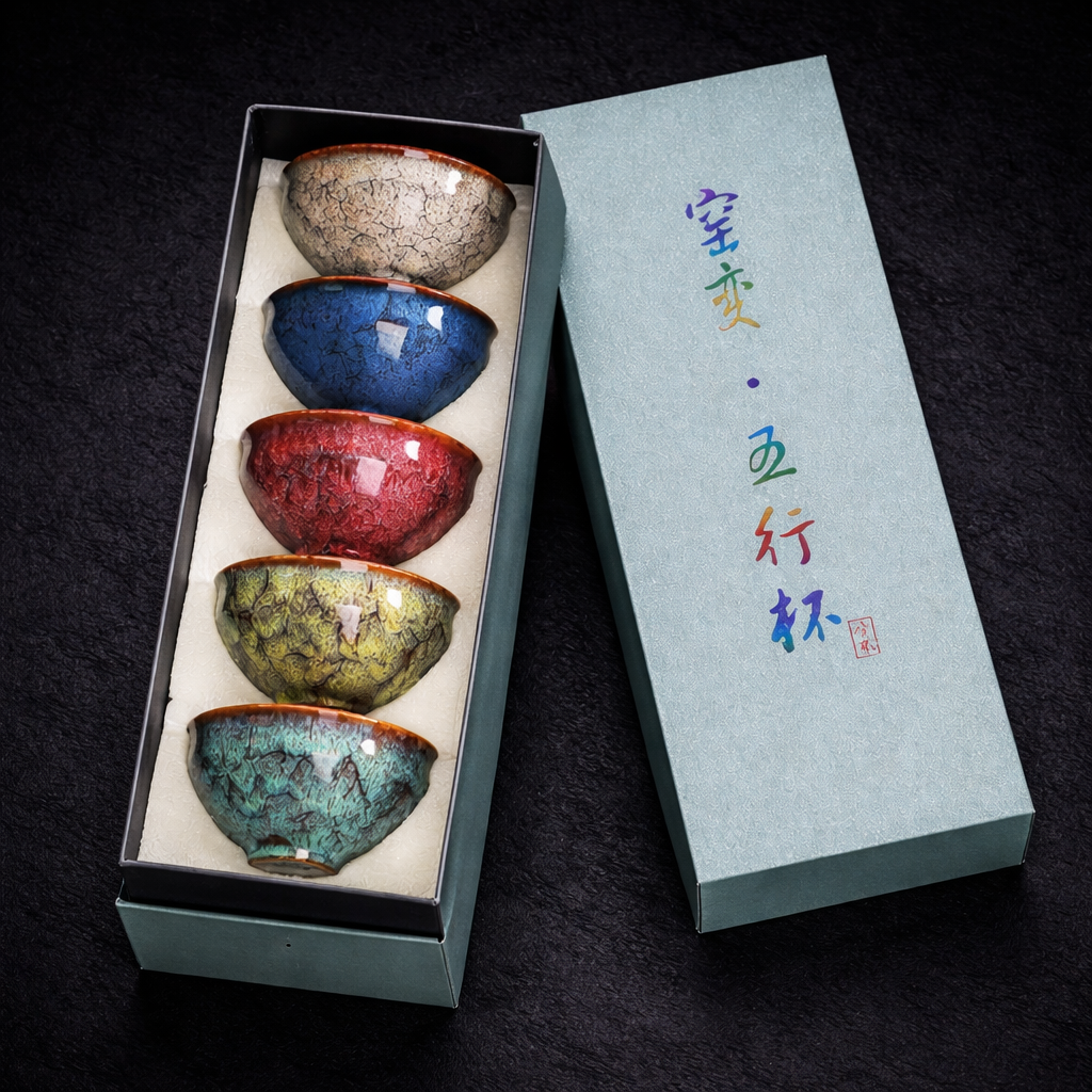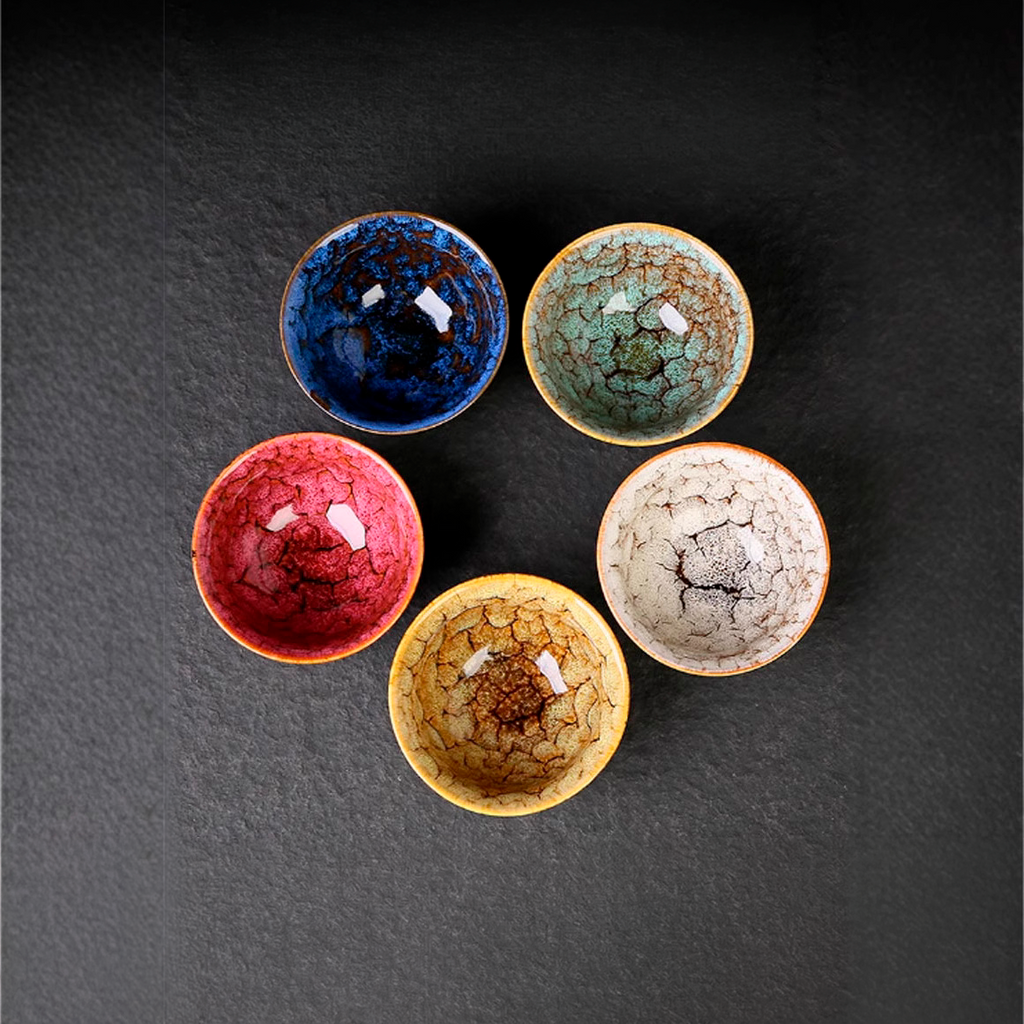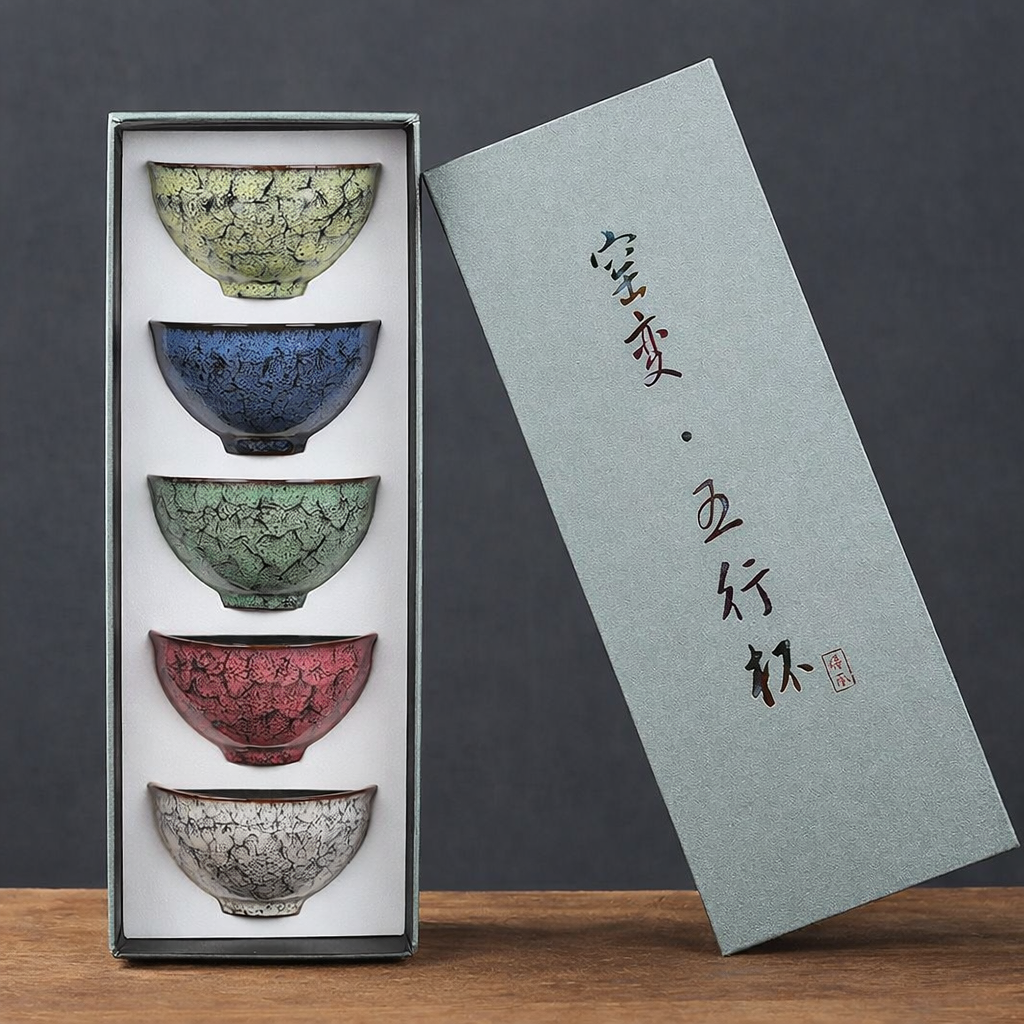 Este set de cuencos está inspirado en la antigua filosofía oriental de los cinco elementos, una visión del mundo que busca el equilibrio entre las energías que componen la naturaleza: agua, fuego, tierra, metal y madera. Cada cuenco presenta un color y un patrón único de esmalte craquelado, evocando la diversidad y armonía de estos elementos en un solo conjunto.